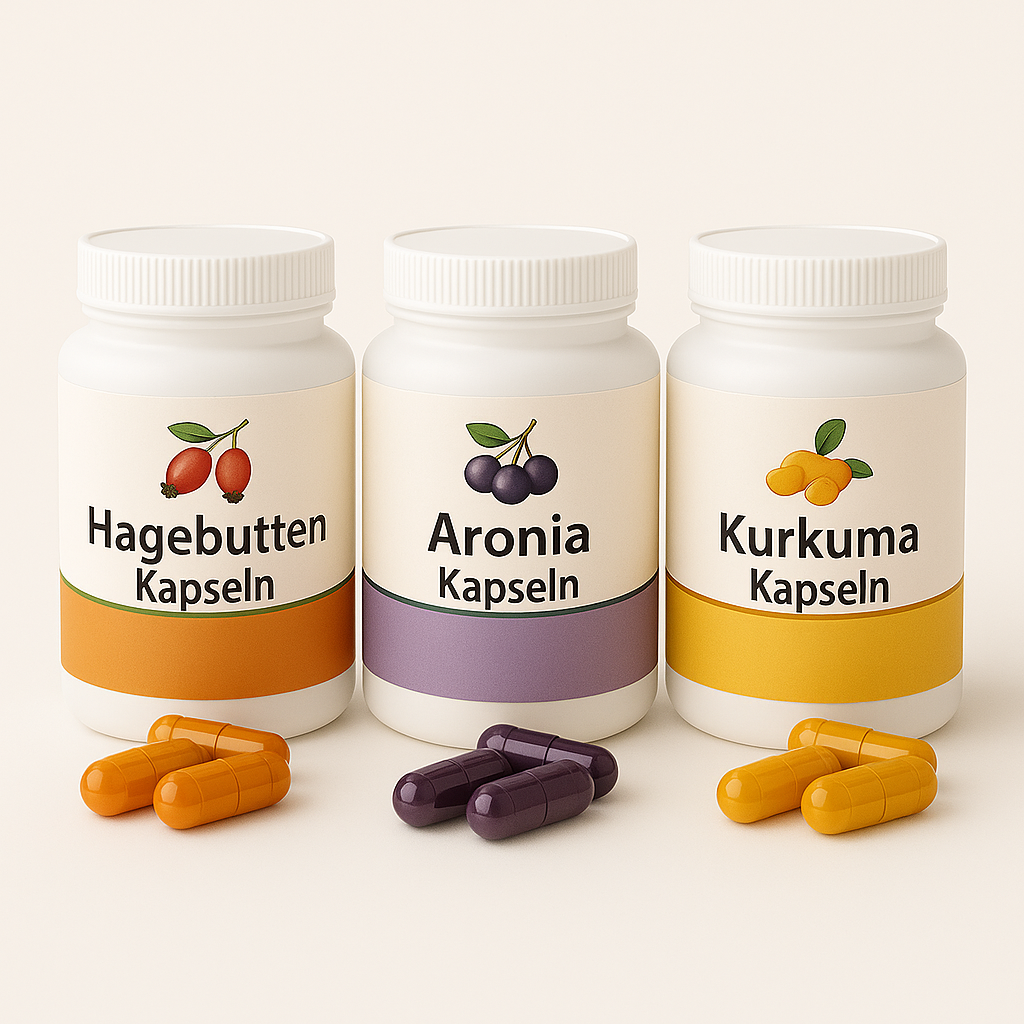 Entdecke die Kraft aus der Natur: Unser Immunstark 3er-Bundle kombiniert drei bewährte Pflanzenstoffe – Aronia, Kurkuma und Hagebutte – in praktischer Kapselform. Ideal für alle, die auf natürliche Weise ihre tägliche Ernährung ergänzen möchten – ohne Zusatzstoffe, rein pflanzlich und hergestellt in Deutschland.